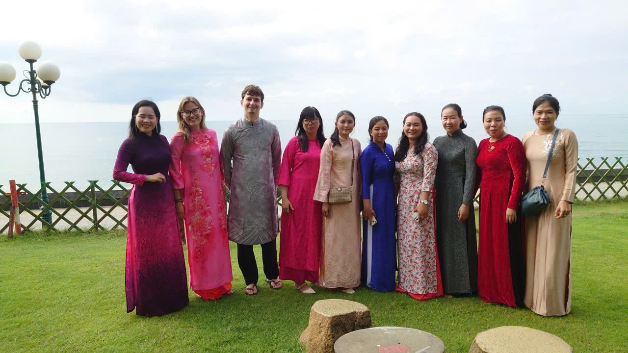 On Friday, I had my last day at the office in Phan Thiet. It was not only my final day there, but also my first time wearing the traditional ao dai. During an English lesson earlier that week, when we talked about clothes, we came up with the idea to start my last day with an English class at the beach, all dressed in ao dai. One of the staff members kindly lent me an ao dai, which I thought is absolutely beautiful.