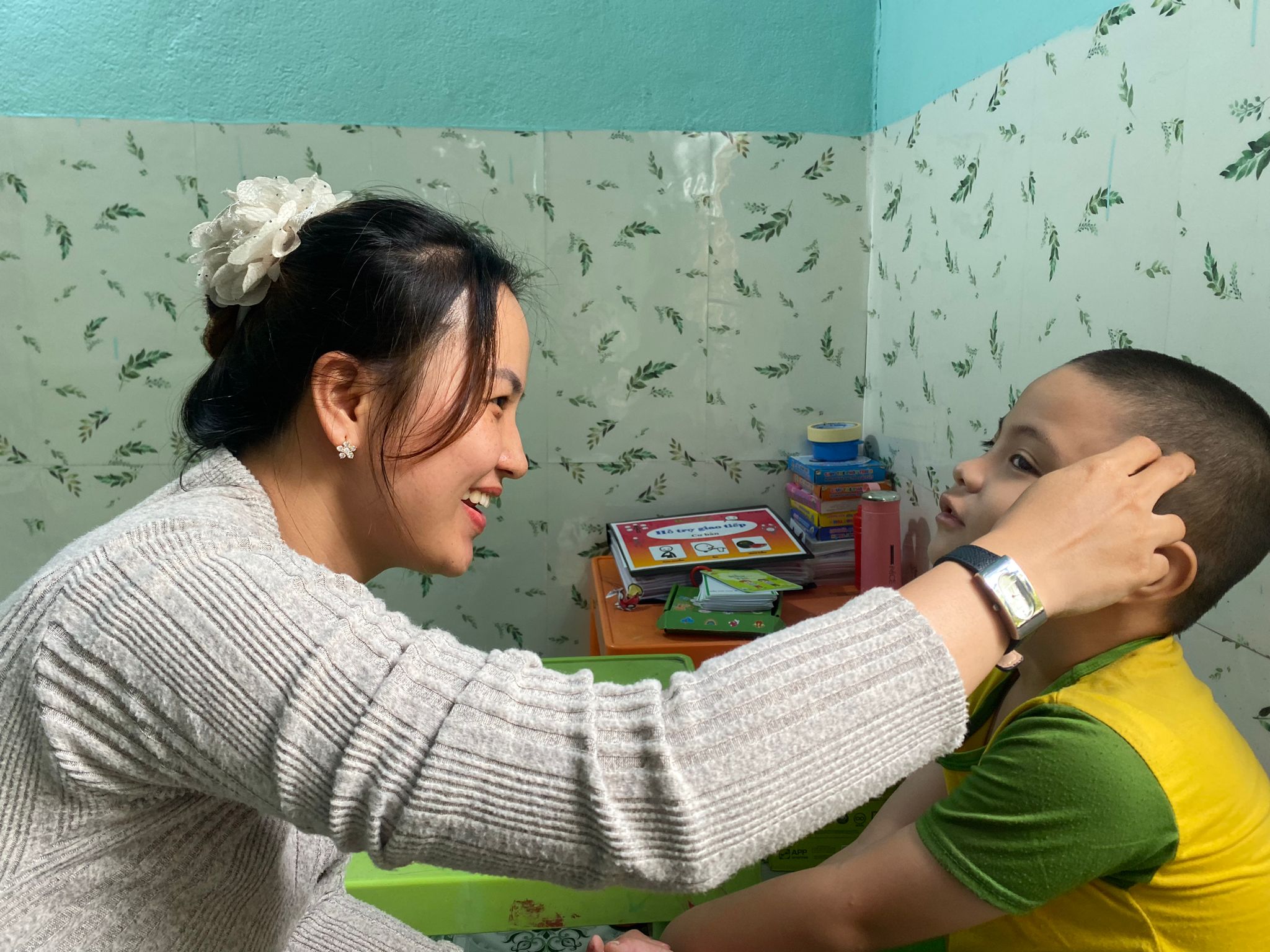 The next child, also six, has autism and has been coming for two years. When he first arrived, he often cried and couldn’t respond to his name or recognize his family. Today, he can turn when called, follow simple instructions like sitting down or tidying up his toys, and sometimes even make eye contact. His progress has been remarkable. He lives with his grandparents, as his mother works far away, and he spends most of his time playing in the garden. The teachers told me that his diet and daily routine have improved a lot since he started here.